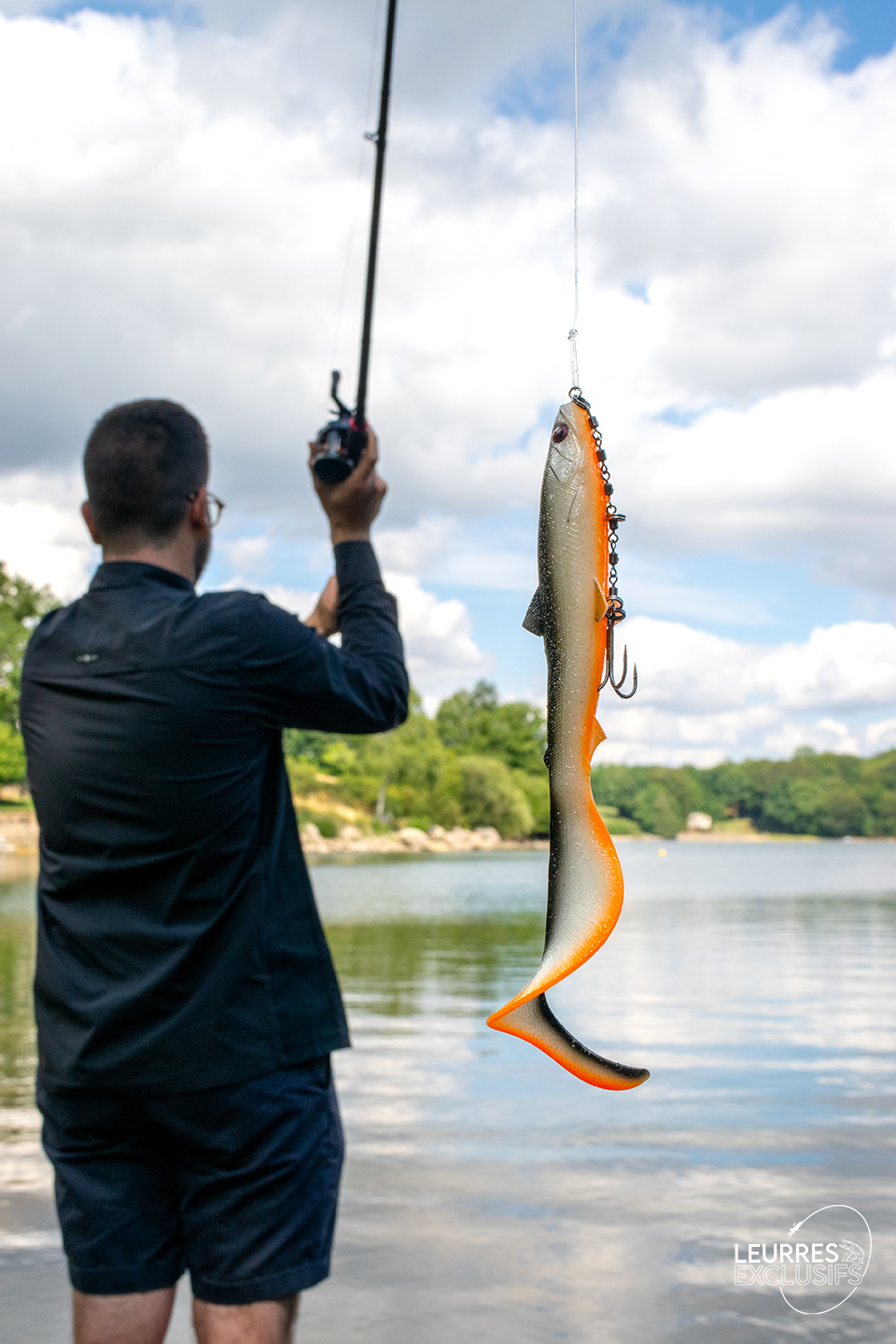 Ce leurre peut être utilisé comme trailer sur des gros chatterbaits, spinner ou même derrière une miuras. Grâce à une fente sur son dos, ce leurre peut aussi être monté en texan. Nous avons mis au point un coloris exclusif simple mais très attractif pour toutes les couleurs d'eau. La partie orangée sur la totalité du ventre du leurre suffit pour lui procurer une nage séduisante à laquelle les brochets et silures ne résisteront pas.